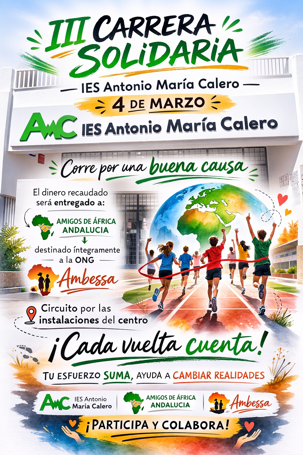 El próximo 4 de marzo celebraremos en nuestro centro la III Carrera Solidaria. Este año, la recaudación será gestionada por la asociación Amigos de África Andalucía y se destinará íntegramente a la ONG Ambessa, en apoyo a un orfanato en …
